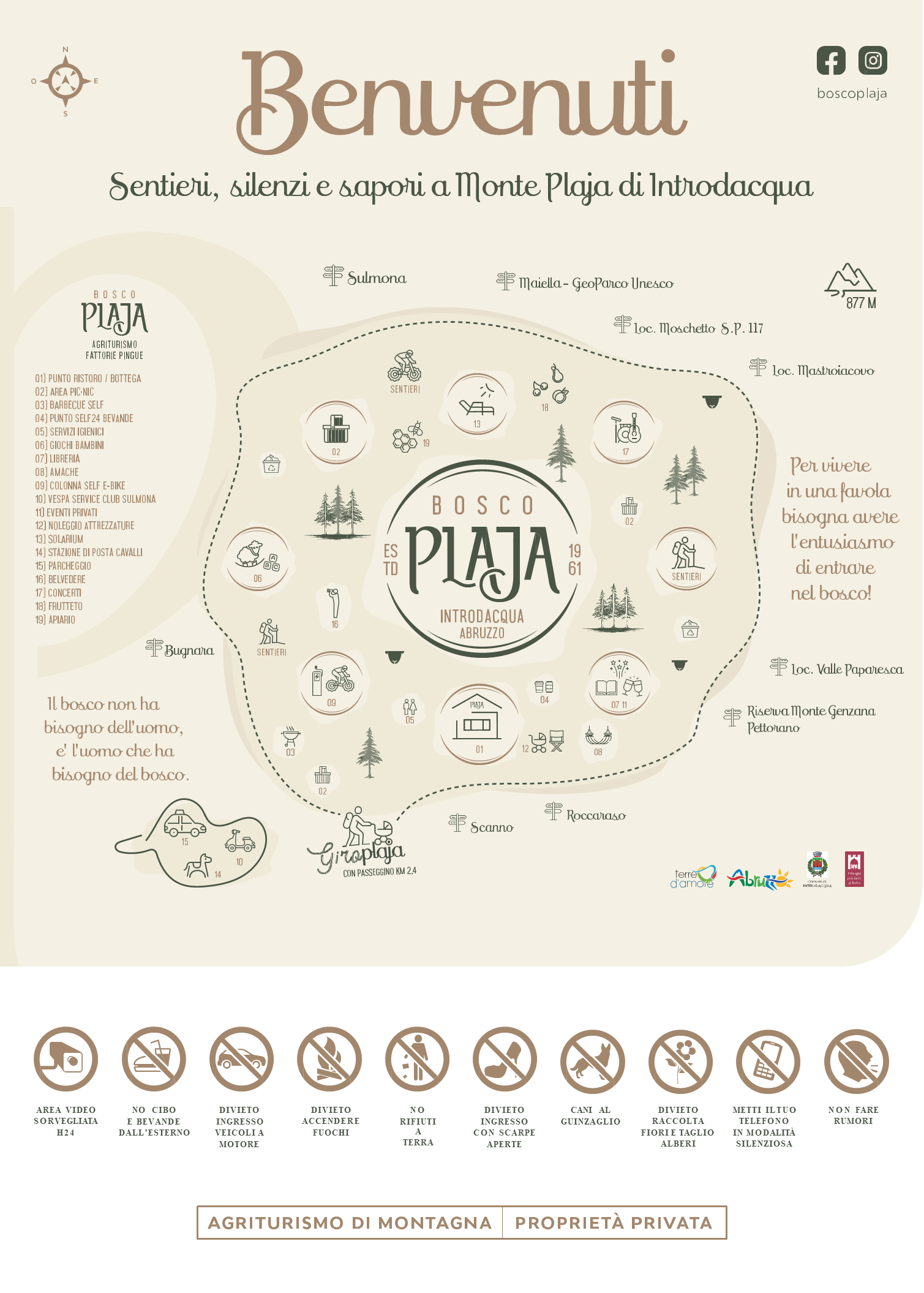Eppure Bosco Plaja è una realtà vera, tutta abruzzese che esiste da due mesi esatti. Dallo scorso 24 giugno a Introdacqua, sul monte Plaja, la collina che si affaccia sulla Valle Peligna, la famiglia Spinosa Pingue, da cinque generazioni imprenditrice del settore agroalimentare sia nella produzione che nella distribuzione, ha creato il Bosco Plaja, un agriturismo fai da te.