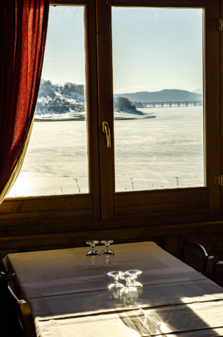 Entrati nella casetta in legno la prima cosa che colpisce è la vista mozzafiato sul lago, in questo periodo quasi completamente ghiacciato, che splende in una rigida e soleggiata giornata di febbraio. Una volta seduti al tavolo, Filomena arriva a presentare il menu. Piatto forte è senz’altro il coregone, un pesce tipico del lago che viene cucinato alla brace o alla marinara. Quest’ultima ricetta è una produzione esclusiva del ristorante per la quale, nel 2003, è stato registrato il marchio: il coregone viene arrostito, poi conservato in un preparato a base di aceto e condito con olio e peperoncino.