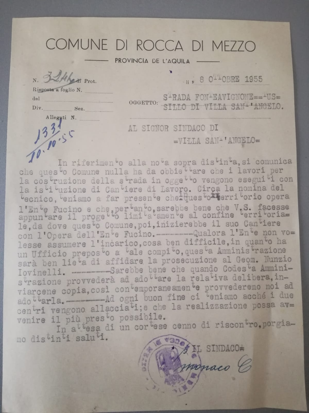 VILLA SANT’ANGELO – “Ci teniamo acché i due centri vengono allacciati; e che la realizzazione possa avvenire il più presto possibile”. Questa la frase conclusiva che il sindaco di Rocca di Mezzo (L’Aquila) inviava l’8 ottobre 1955 al suo collega di Villa Sant’Angelo (L’Aquila), a proposito di una strada di collegamento tra i due paesi, da sempre divisi dalla montagna.
