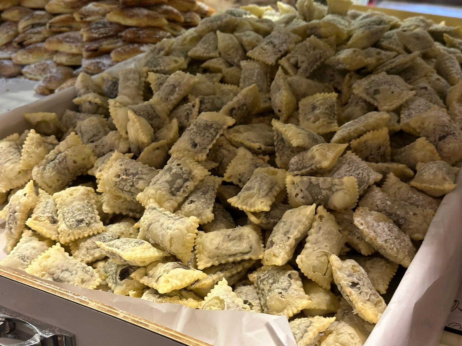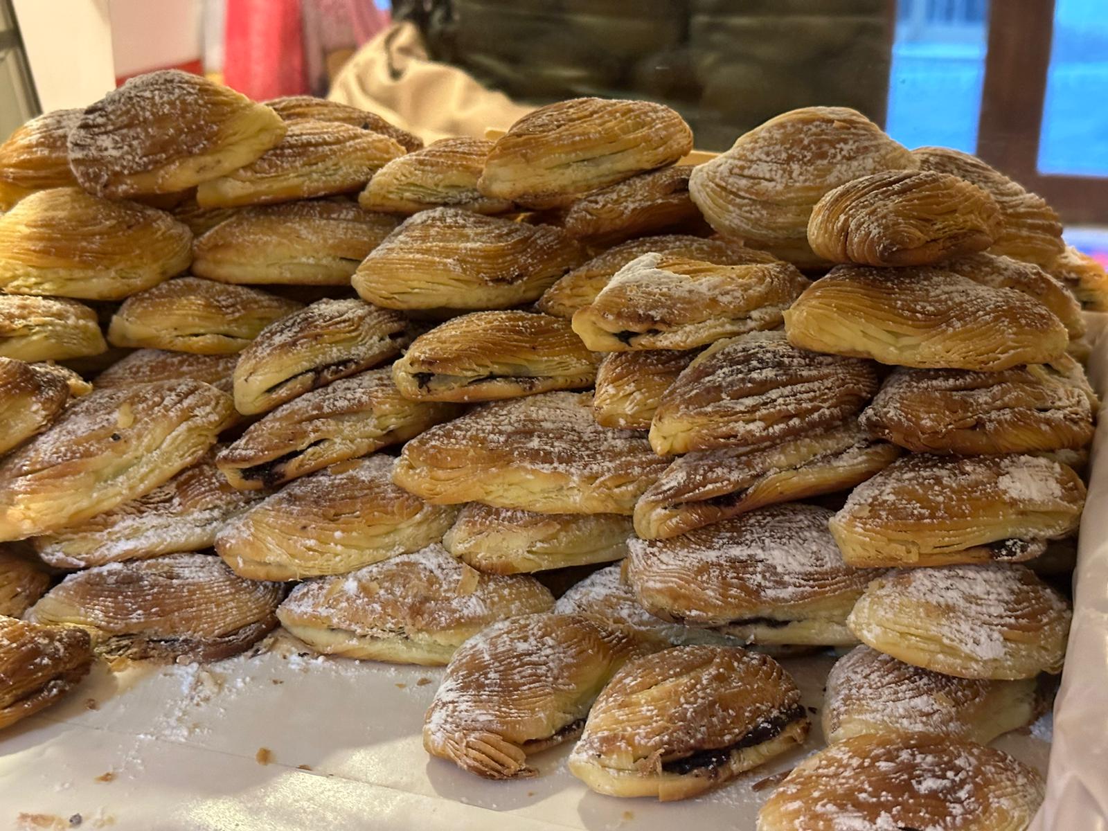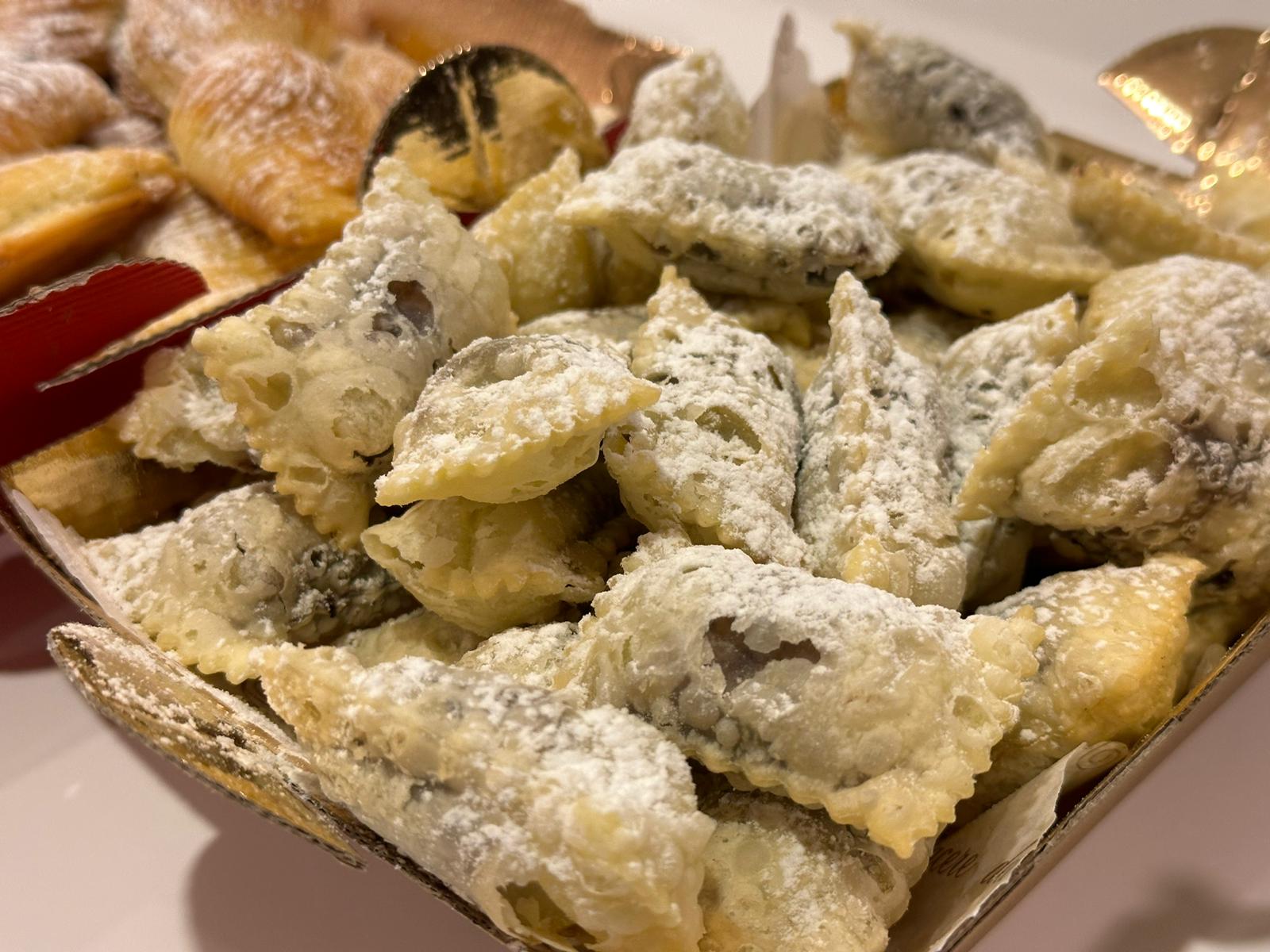 In Abruzzo, le sfogliatelle sono un dolce tipico delle festività natalizie, accanto a bocconotti e calcionetti. La bottega offre anche i “caggionetti” o calcionetti, con una farcia classica alla castagna o con ceci, e inaspettatamente con marmellata d’uva artigianale, conferendo loro un carattere unico nel loro genere.