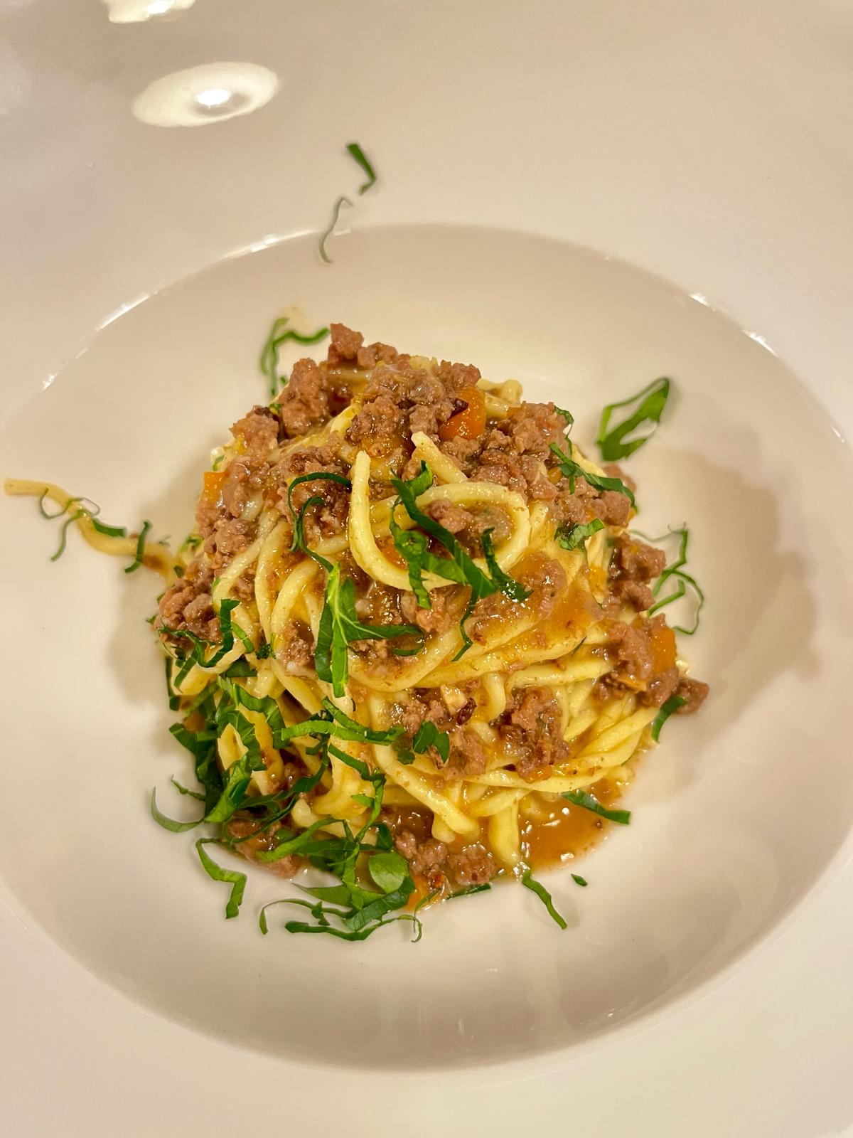 “La cottura di questo tipo di carne è semplice, prevedendo una piastra fry top, più complicato è creare l’abbinamento giusto. Il ragù che abbiamo preparato per questa sera ha avuto una preparazione più lunga degli altri piatti, ed è composto dal suo fondo bruno e da note agrumate che abbiamo voluto inserire per stemperare il grasso caratteristico di questa carne”, ha detto lo chef Antonello Camardese.