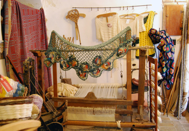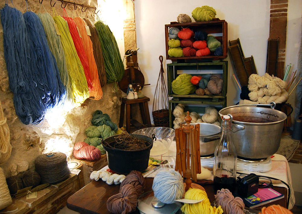 Entrando in bottega si è subito immersi in un altro tempo: tra le sfumature delle lane, colpisce un vecchio telaio che occupa buona parte della stanza, l’arcolaio e le pentole in cui tinge la lana. Non si tratta però, come in molti casi, di un’antichità costruita a tavolino per incantare i turisti ma di un vero laboratorio in cui si reinventa la trasformazione della lana, partendo dalle conoscenze della tradizione e valorizzandole con studio, inventiva e nuovi canali di comunicazione.