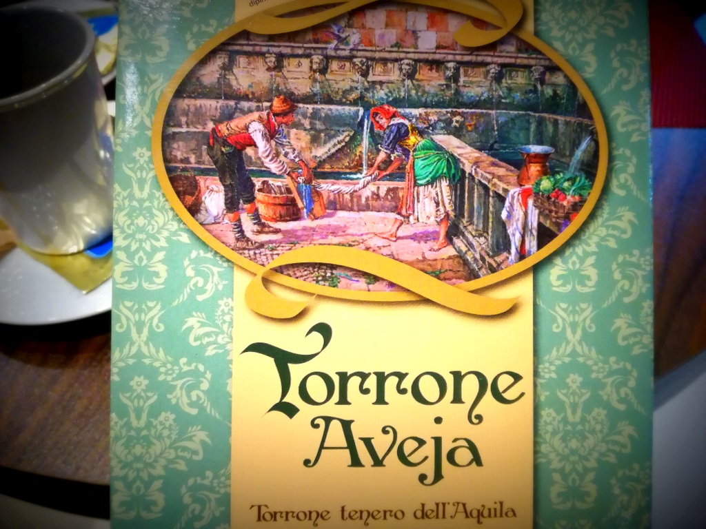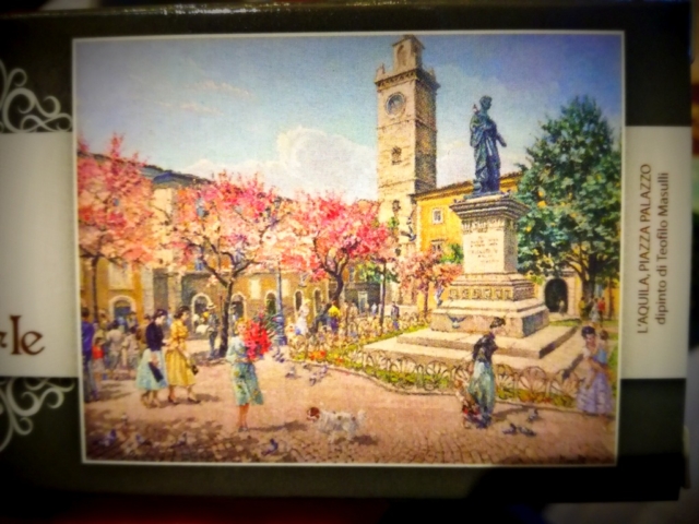 Sulla scatola del classico torrone aquilano morbido al cioccolato, tra i dipinti del maestro Masulli, è disegnata la Fontana delle 99 Cannelle con le lavandaie che fanno il bucato, così come si usava una volta, sulla confezione del bianco morbido alle mandorle è riportata la torre civica di Palazzo Margherita, un incantevole scorcio di Piazza Duomo invece colora l’incarto del nocciolato gianduia.