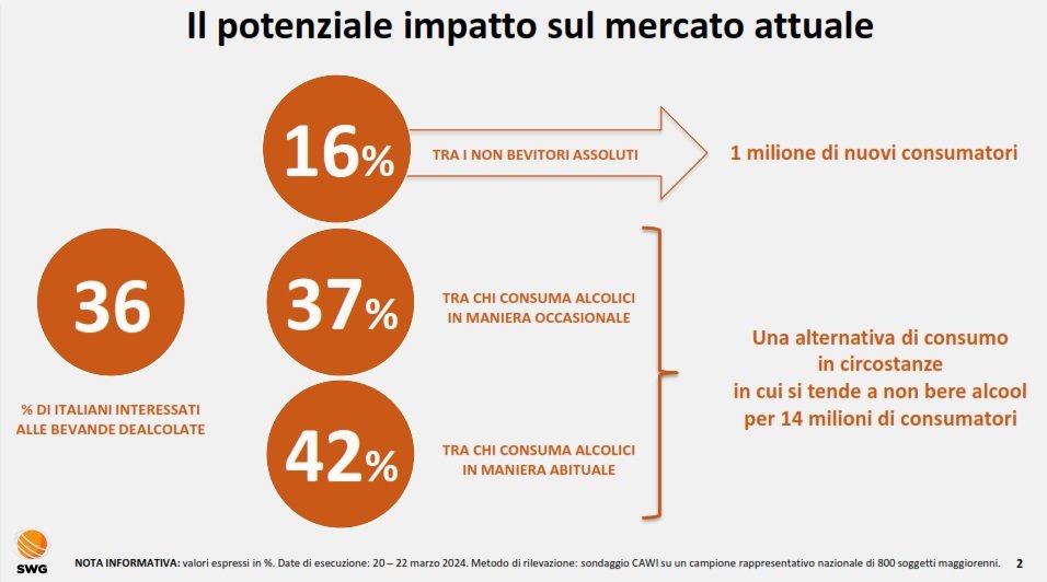 Secondo un’indagine realizzata da Swg e dall’osservatorio del vino Uiv In Italia il 36% dei consumatori è interessato a bevande dealcolate. Di questi il 16 per cento sono non bevitori di alcolici, cioè un potenziale di un milione di persone; il 37 sono coloro che consumano alcolici in maniera occasionale; e il 42 per cento sono invece consumatori abituali. Questa parte restante (14 milioni circa) li ritiene un’alternativa di consumo in situazioni specifiche come mettersi alla guida.