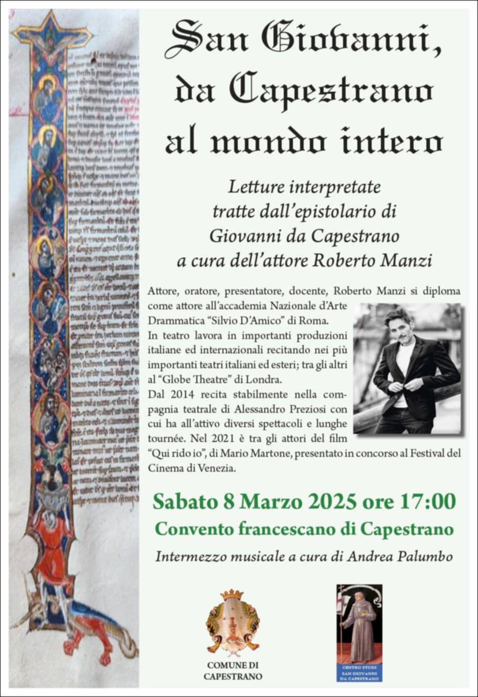 CAPESTRANO – Risvolti e sfumature più intime e personali della vita di San Giovanni da Capestrano andranno in scena sabato 8 marzo alle ore 17,00 all’interno del Convento francescano a Capestrano (L’Aquila) grazie all’interpretazione teatrale curata dall’attore professionista Roberto Manzi in “San Giovanni, da Capestrano al mondo intero”, al quale saranno affidate le letture di epistole selezionate dal Comitato scientifico del Centro Studi San Giovanni da Capestrano.