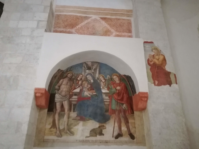 L’AQUILA – Alla chiesa di San Silvestro all’Aquila, ancora non si può accedere dal portone principale, per questo entriamo da una porticina sul lato sinistro: al primo passo all’interno della chiesa, la cappella Branconio ci toglie il fiato per la sua bellezza. I colori sono vividi, le figure nette, la luce che emanano è potente. Ci si sente letteralmente avvolti.