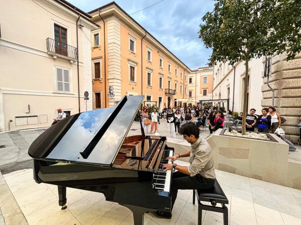 L’AQUILA – Le dita di Giulia Mangone accarezzano i tasti del pianoforte a coda, installato davanti alle vetrine di via Verdi. Davanti ai suoi occhi chiari scorrono le partiture di Isaac Albéniz in Asturias, in Granada – le “suite spagnole” – ma anche le complicate evoluzioni di Sergej Rachmaninov. Prima e dopo di lei, altri giovani pianisti regalano preludi, interludi e postludi ai clienti dei locali di prossimità o alle tante persone di passaggio nella notte di L’Aquila Suona.