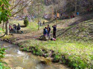 Non lontano dal santuario, infatti, decine e decine di famiglie si sono ritrovate in mattinata, disposte quasi spontaneamente intorno al cerchio della colazione dolce e salata, che qui continua anche dopo Pasquetta. La pizza di Pasqua aquilana, i formaggi e i salumi locali in mezzo al cerchio, sul prato che domina il torrente Raiale e dista pochi metri dalla strada per Fonte Cerreto.