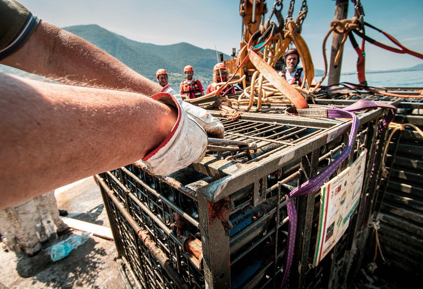 In principio il tempo di affinamento è di un anno, poi sale a due, a tre e oggi è sui cinque, con l’intento di arrivare a dieci. Le bottiglie, bloccate in gabbie, sono tappate con uno speciale tappo a corona “capace di resistere alla pressione e la corrosione”, chiarisce. Riemerse, restano in quelle gabbie che verranno usate per la messa in punta, che avviene in una cantina sulla terraferma fino all’autunno, quando avviene la sboccatura, senza aggiunta di zuccheri.