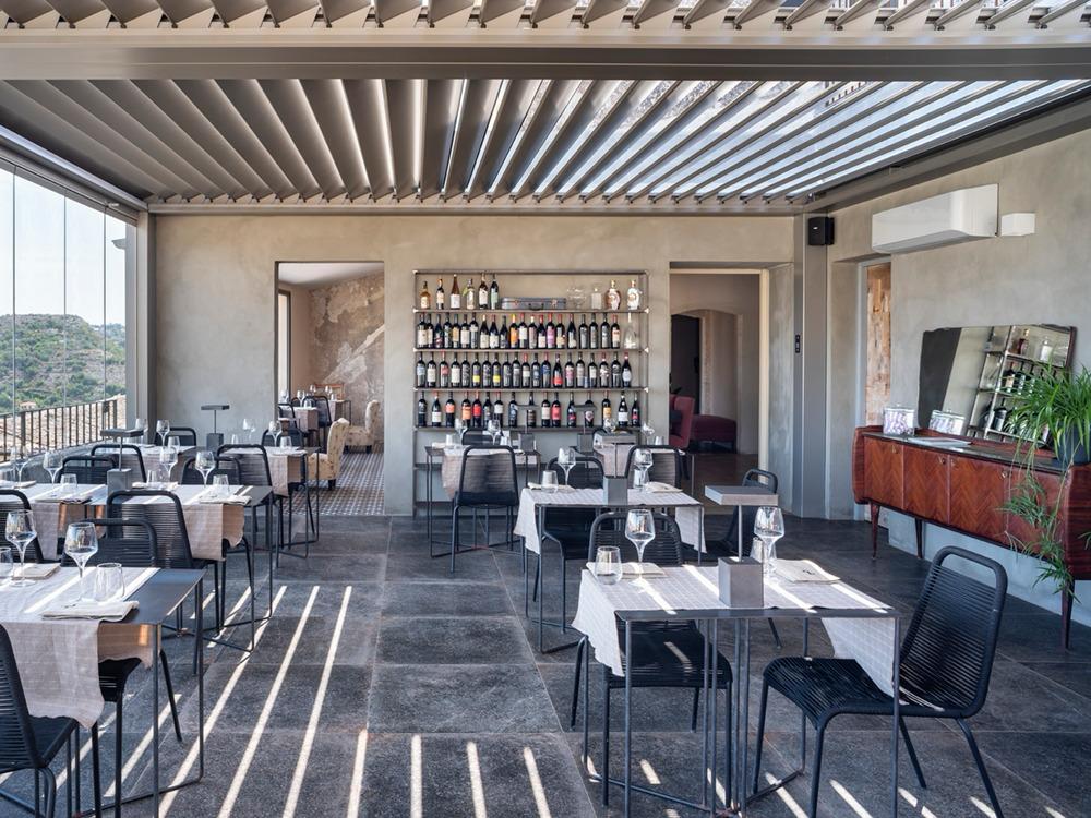 La carta dei vini conta circa 80 etichette, il 70% delle quali siciliane. Gli spazi sono ampi e flessibili: 80 coperti all’interno e fino a 200 all’esterno, tra giardino e terrazze panoramiche.