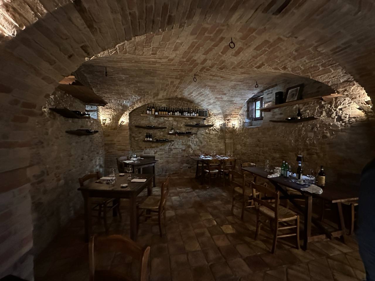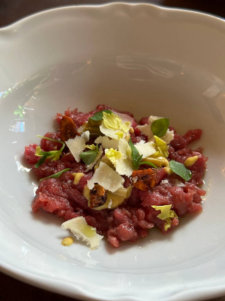 Gli ospiti possono gustare antipasti preparati su un tavolo da falegname, che offre una scenografica vista dei ricercati impiattamenti. Per il formaggio fritto e i primi piatti, invece, ci pensa la cucina. Tra le proposte culinarie, spiccano piatti come la battuta di manzo con funghi porcini freschi, il cacio fritto con rosmarino e limone, la terrina di patate, la succulenta trippa, verza e mele e la coratella di agnello in casseruola.