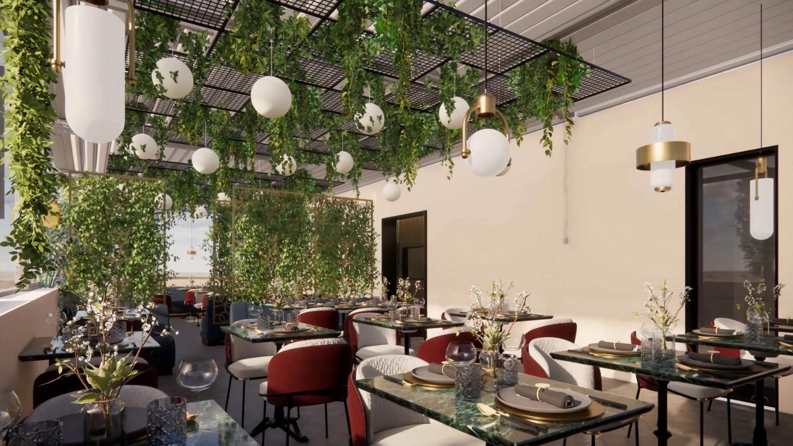 L’ambiente accoglie gli ospiti in spazi curati nei minimi dettagli, con materiali naturali come pietra, marmo, ferro e vetro, che danno vita a uno stile essenziale ma elegante. Il ristorante dispone di 50 coperti sulla terrazza e altri 40 nel lounge bar panoramico, situato sul rooftop.