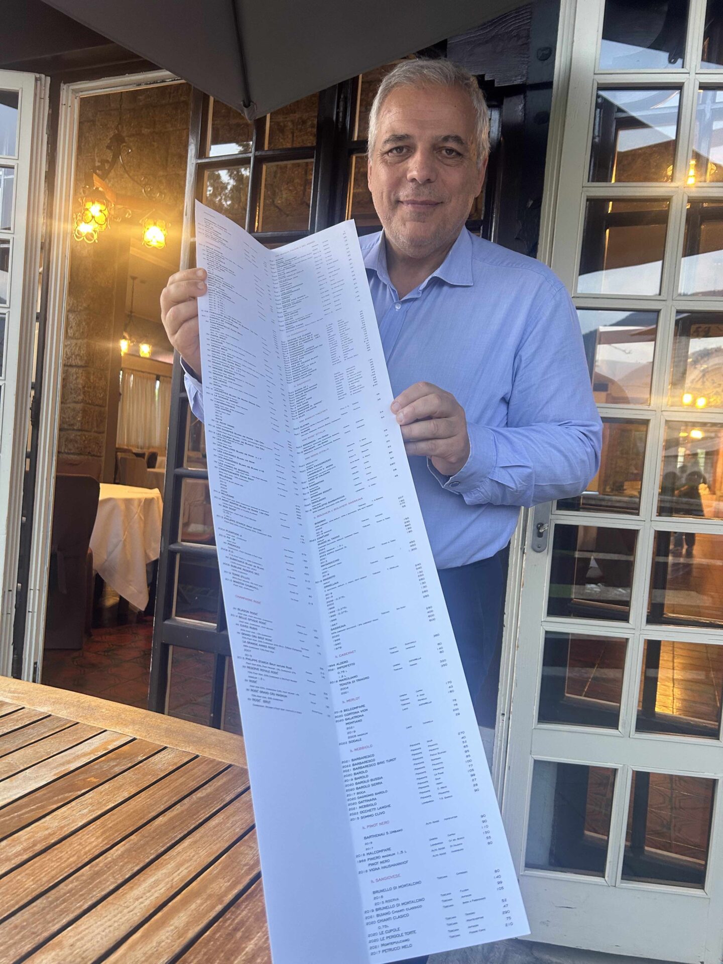 La menzionata carta si presenta davvero come “un metro di paragone” visto che è alta esattamente un metro e suddivisa in facciate fitte di etichette organizzate per aree, vitigni e tipologie, con una straordinaria selezione di Champagne di cui Fabio è grande estimatore e intenditore, tanto che all’interno del Lounge Bar, proprio nel passaggio che porta alla sala interna del Ristorante “Il Caminone”, campeggia eloquente la scritta Champagnerie “Clos des Goisses”.