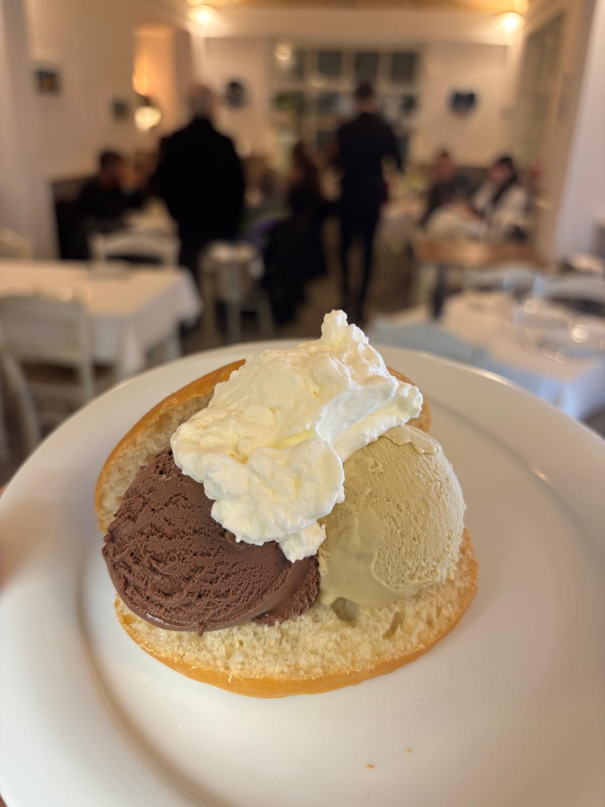 E poi riprende il filo. “Babà e maritozzo sono un modo per accompagnare il mio gelato semplice e genuino, mentre la nostra pizza dolce deriva dallo studio della zuppa inglese nostrana bagnata con rum e caffè” .