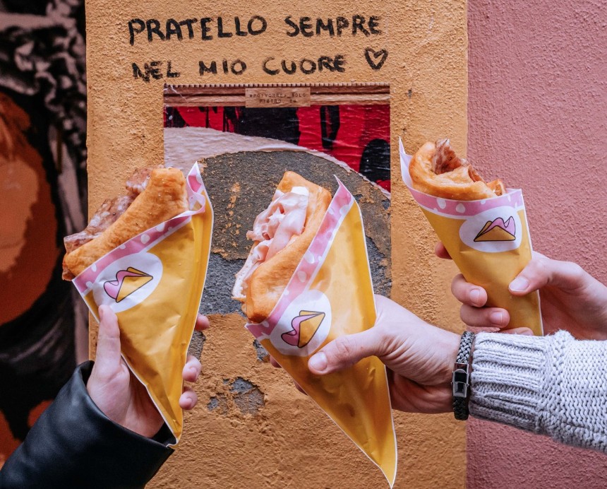 Il risultato sono crescentine come l’iconica 50 Special a base di porchetta, crocchetta di patate alla piastra, cipolle caramellate e provolone affumicato, ma anche tortellini e cappellacci di zucca fritti e accompagnati da crema di Parmigiano Reggiano.