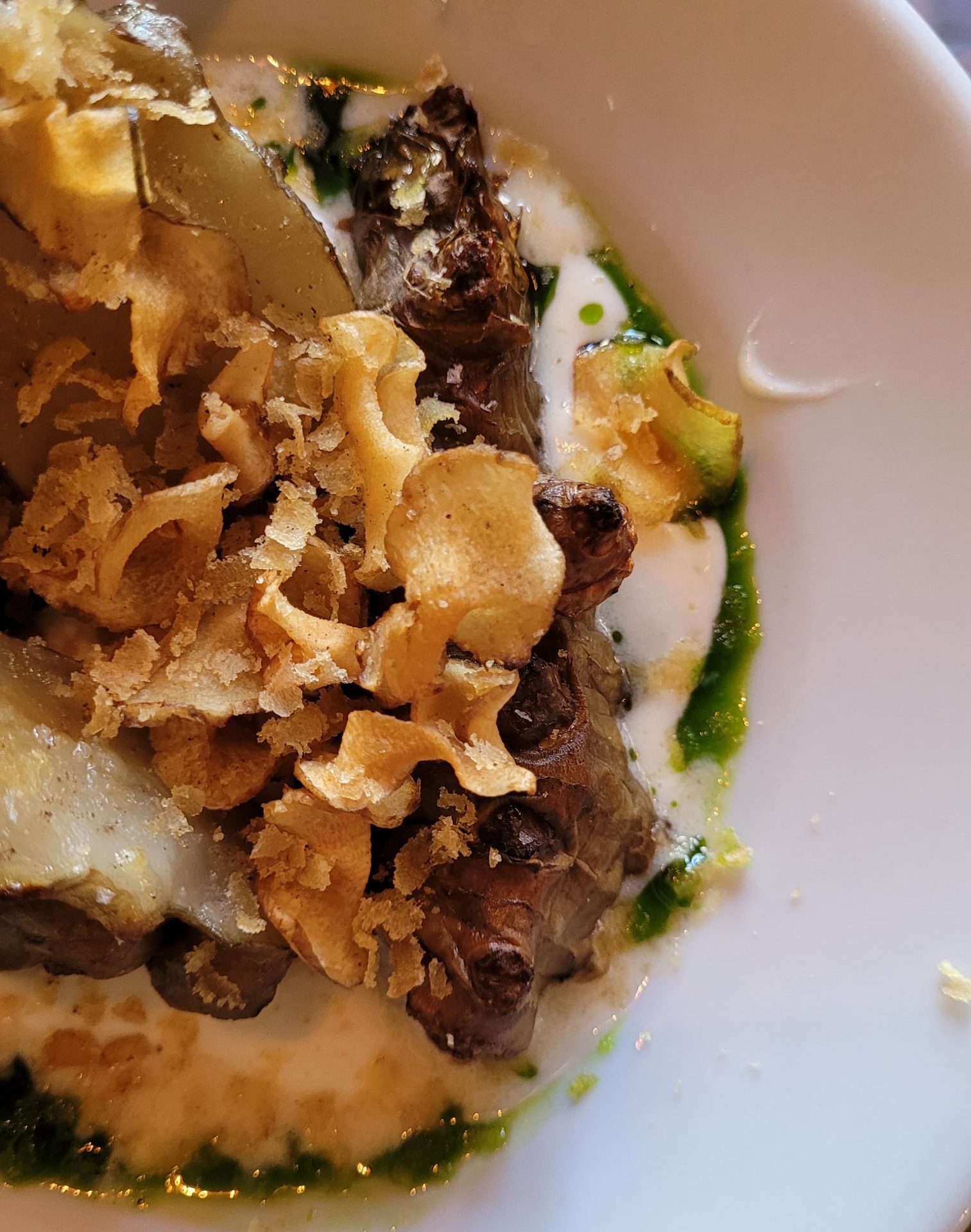 Tutto questo lascito l’ha messo nella sua cucina identitaria basata sulla tecnica, sulla curiosità e sulla valorizzazione del territorio. Il menu offre la possibilità di scegliere alla carta con una suddivisione delle portate che include pietanze da condividere, per continuare o per accompagnare, ma anche la possibilità di intraprendere un percorso degustazione da 8 portate a 48,00 euro.