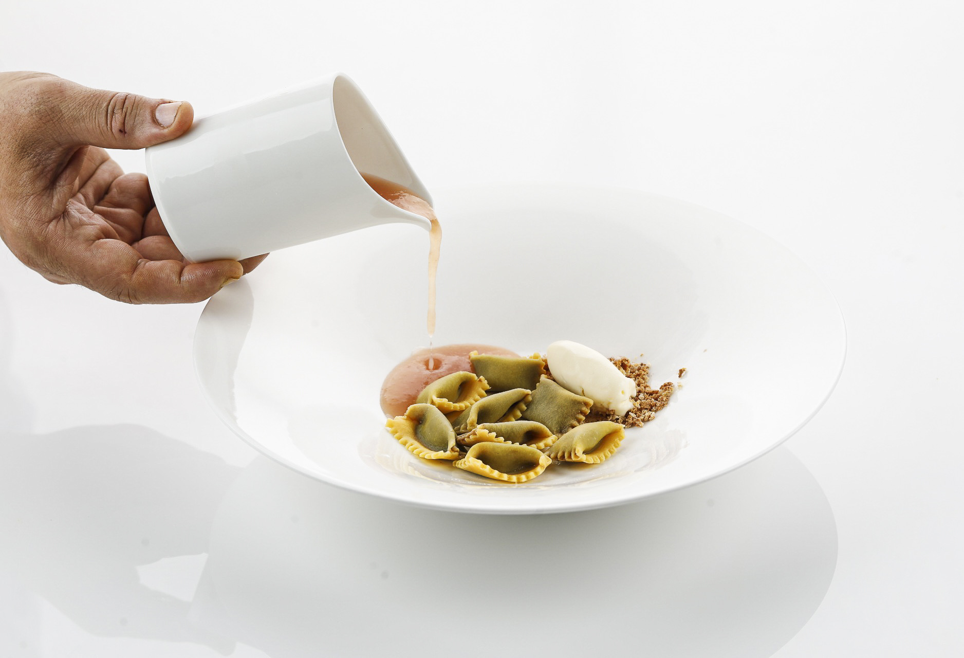 Agnolotti ripieni al cioccolato e amaretti in brodo di pesche e gelato al caprino