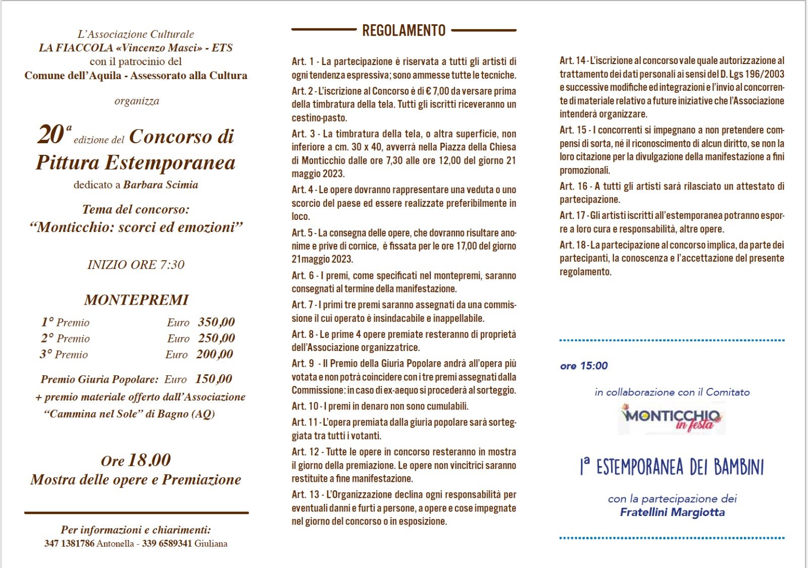 L’AQUILA – Al via la ventesima edizione del concorso di pittura estemporanea dedicato a Barbara Scimia, organizzato dall’Associazione culturale La fiaccola Vincenzo Masci Ets, e patrocinato dal Comune dell’Aquila e da Coop centro Italia sezioni soci.