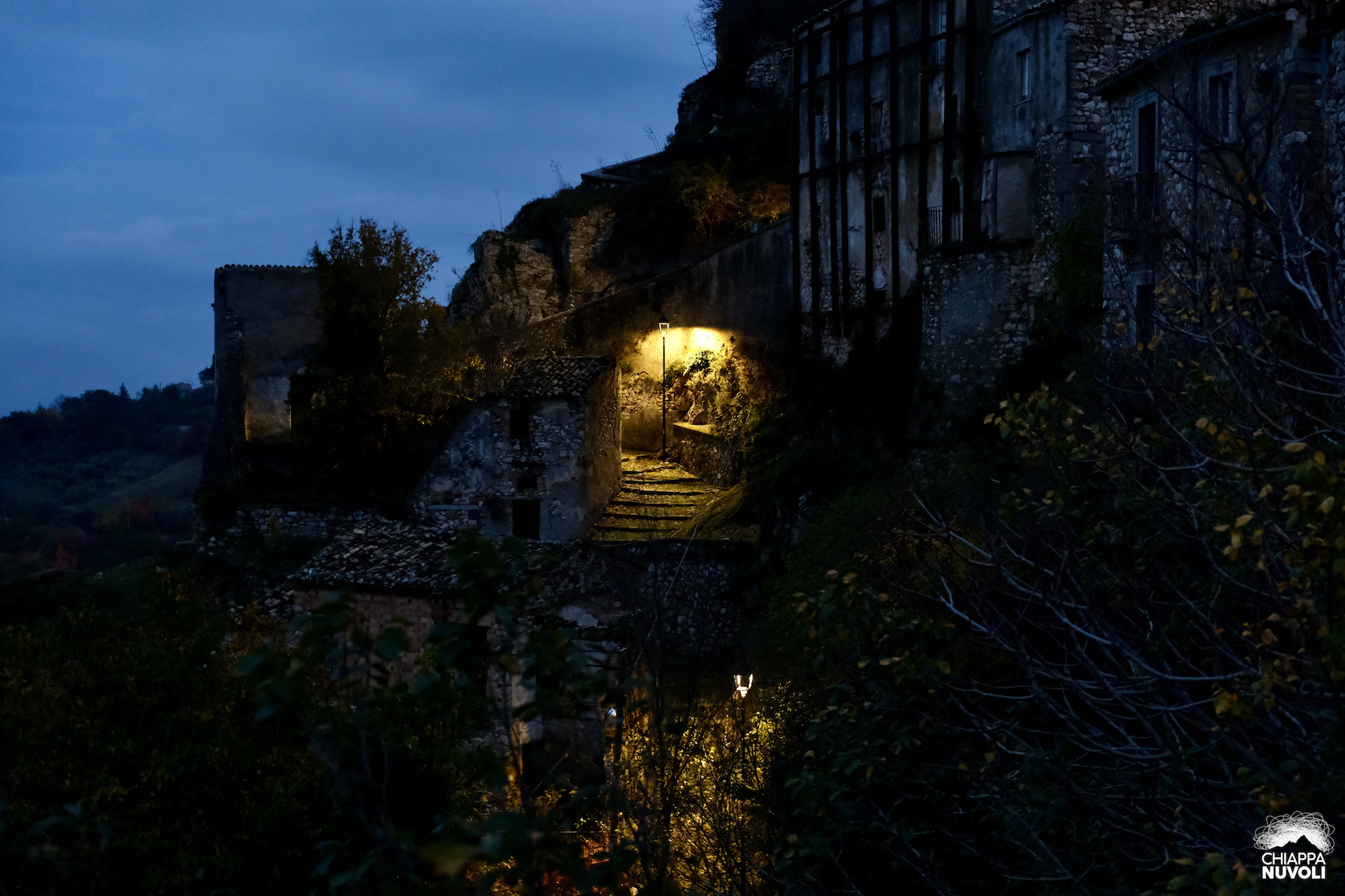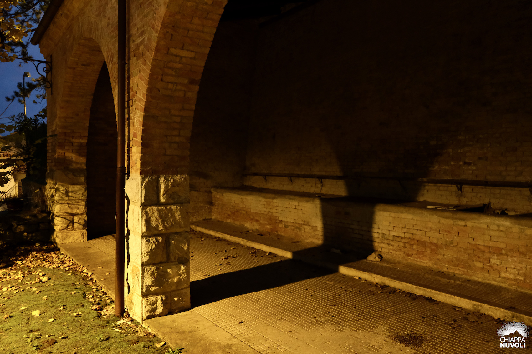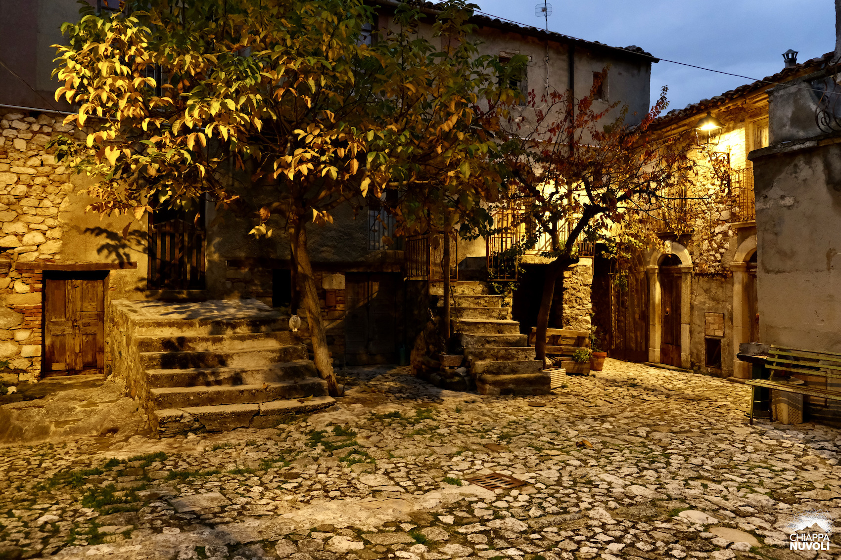 Arriviamo in paese dalla Contrada Le Mandre. Il piazzale che incontriamo sembra ristrutturato di recente, come pure la sorta di balconata che fa da accesso. Il panorama intorno tende al color vinaccia. Vinaccia le montagne verso il Gran Sasso, vinaccia la distesa di colline che arriva fino al mare. Pochi passi e i lampioni si accendono: l’arancione contamina il crepuscolo.