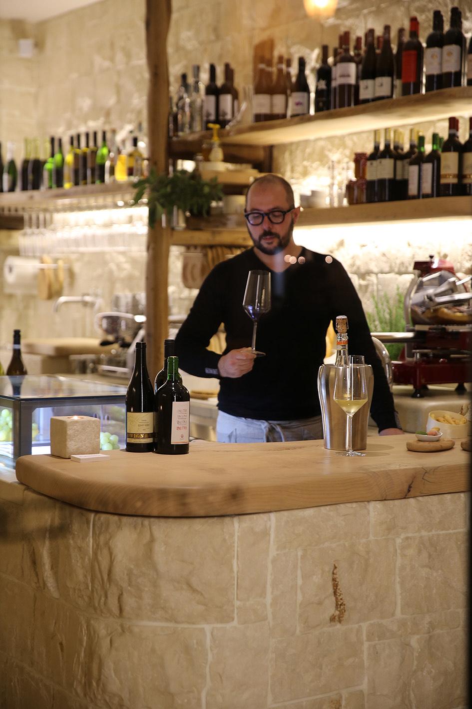 Infatti, in appena 15 mq rivestiti di pietra naturale e legno, grazie al supporto dell’artista contemporaneo Luca Rento, ci si ritrova al banco o nei 15 posti a sedere all’interno per assaporare una proposta unica di portate, chiamate bocconi d’autore, servite su legno di cedro e ceramica; mentre i vini, provenienti soprattutto dal bellunese, possono essere tutti ordinati anche al calice per accompagnare le specialità gastronomiche del territorio come salumi e formaggi; oppure si può optare per lo Champagne tra una selezione di 30 etichette, da poter degustare anche questo al calice.